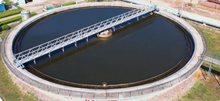 從生化池流出的污水隨后進入上圖中這個圓滾滾的二沉池,它是可以通過重力作用將水與污泥分離開。大家看,現在的水是不是很清澈了呀~這個水平已經優于目前許多城市的內湖或者是景觀河流的水平了。污水到達這里,就是生化處理的整個過成了。